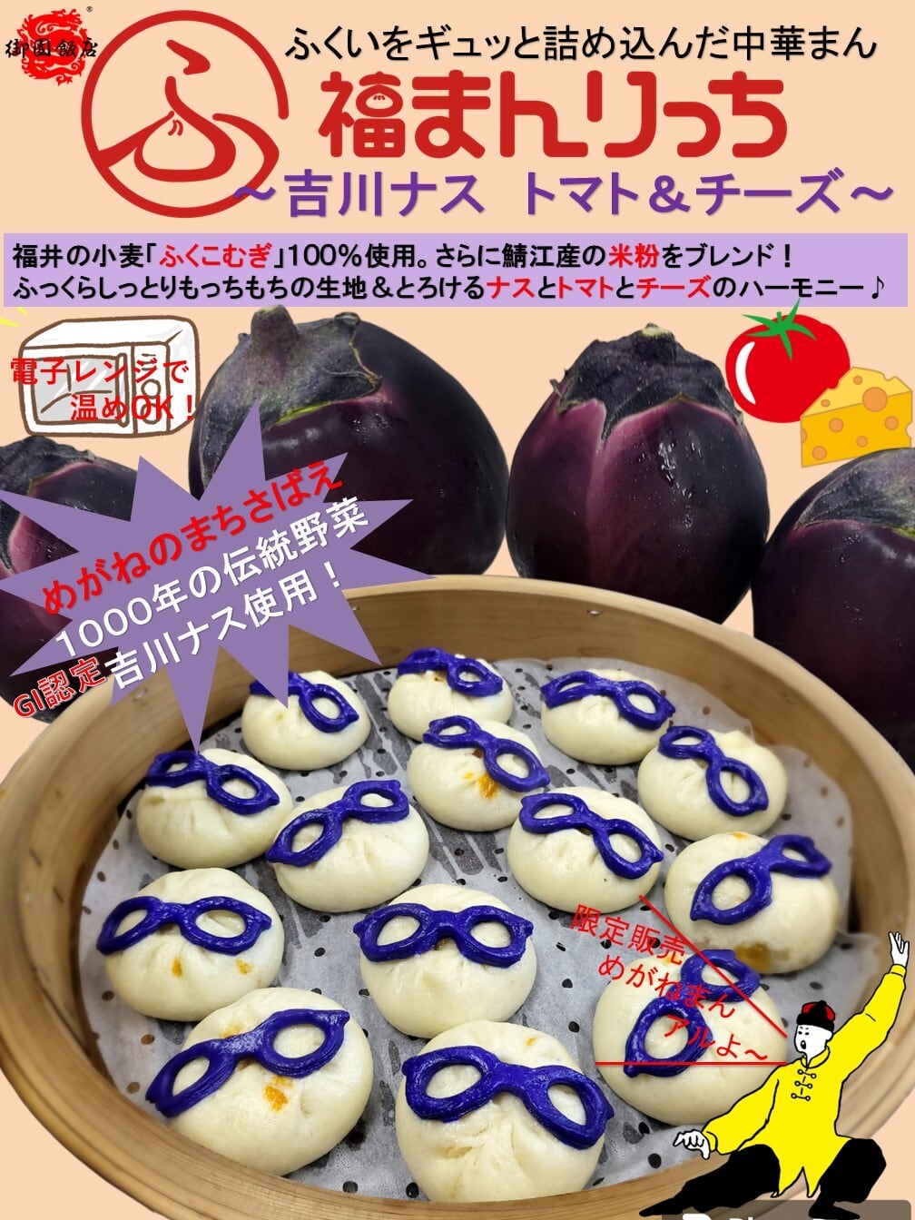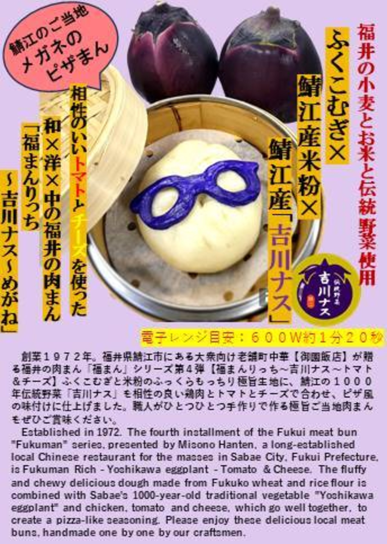 Established in 1972. The fourth installment of the Fukui meat bun "Fukuman" series, presented by Misono Hanten, a long-established local Chinese restaurant for the masses in Sabae City, Fukui Prefecture, is Fukuman Rich - Yoshikawa eggplant - Tomato & Cheese. The fluffy and chewy delicious dough made from Fukuko wheat and rice flour is combined with Sabae's 1000-year-old traditional vegetable "Yoshikawa eggplant" and chicken, tomato and cheese, which go well together, to create a pizza-like seasoning. Please enjoy these delicious local meat buns, handmade one by one by our craftsmen.