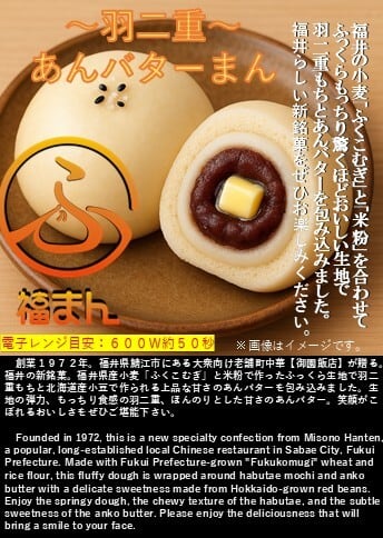 創業1972年。福井県鯖江市にある大衆向け老舗町中華【御園飯店】が贈る。福井の新銘菓。福井県産小麦「ふくこむぎ」と米粉で作ったふっくら生地で羽二重もちと北海道産小豆で作られる上品な甘さのこしあん、そしてコクと風味あるバターを包み込みました。生地の弾力、もっちり食感の羽二重、ほんのりとした甘さのあんバター。笑顔がこぼれるおいしさをぜひご堪能下さい。