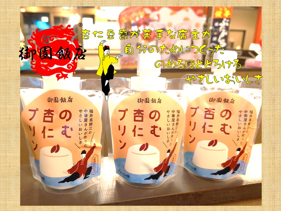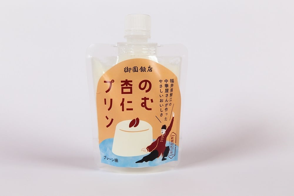 創業1972年の老舗町中華「御園飯店」の大人気の「杏仁プリン」をそのままワンハンドで飲めるかわいいイラストのパウチに詰めた「のむ杏仁プリン」。プリンといっても卵は不使用。牛乳と上白糖、アルコール分を飛ばした杏露酒を寒天で固めた、口あたりさわやかな一品です。